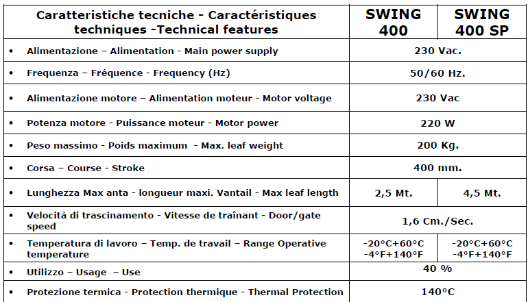 - Per cancelli fino a 200 kg di peso e 2,5 m (4,5 m. Versione 400